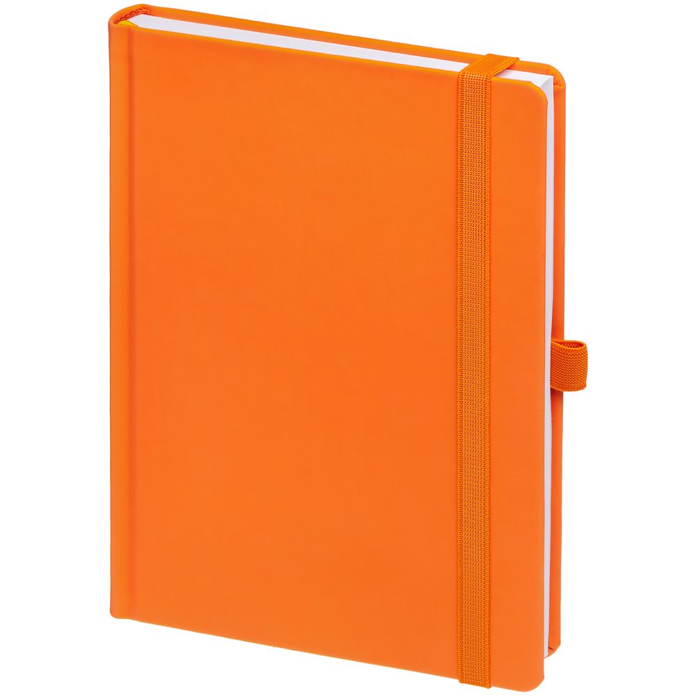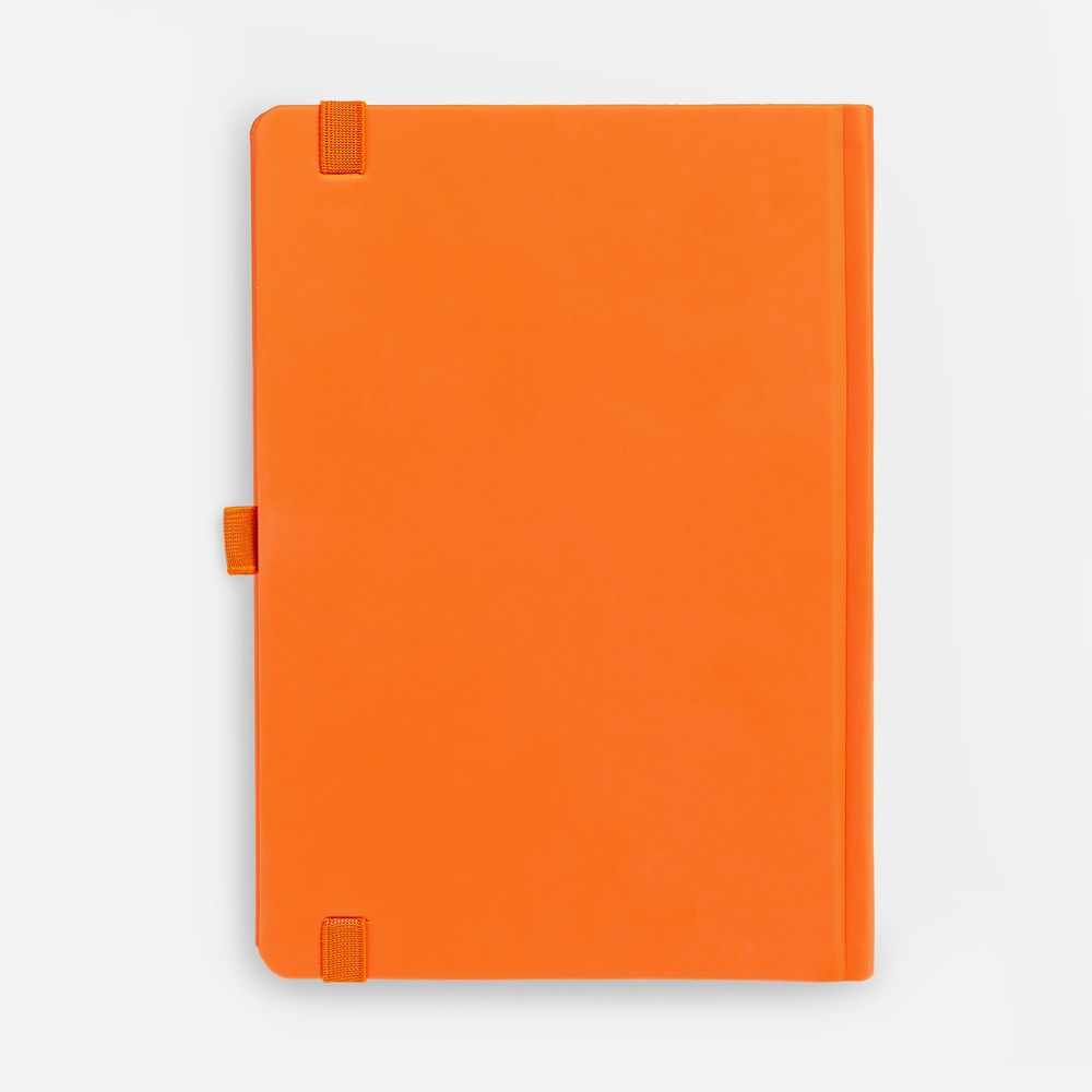 Ежедневник с твердой обложкой без поролона, выполнен из материала Soft Touch, оранжевый ОО, дополнен резинкой шириной 1 см, петлей-резинкой для ручки, капталом и ляссе оранжевого цвета.