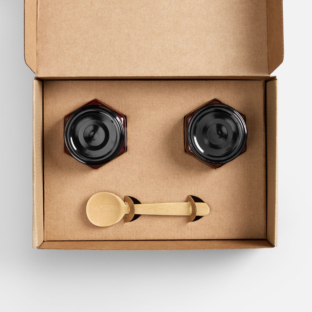коробка - микрогофрокартон; баночки - стекло, жесть; ложка - бамбук