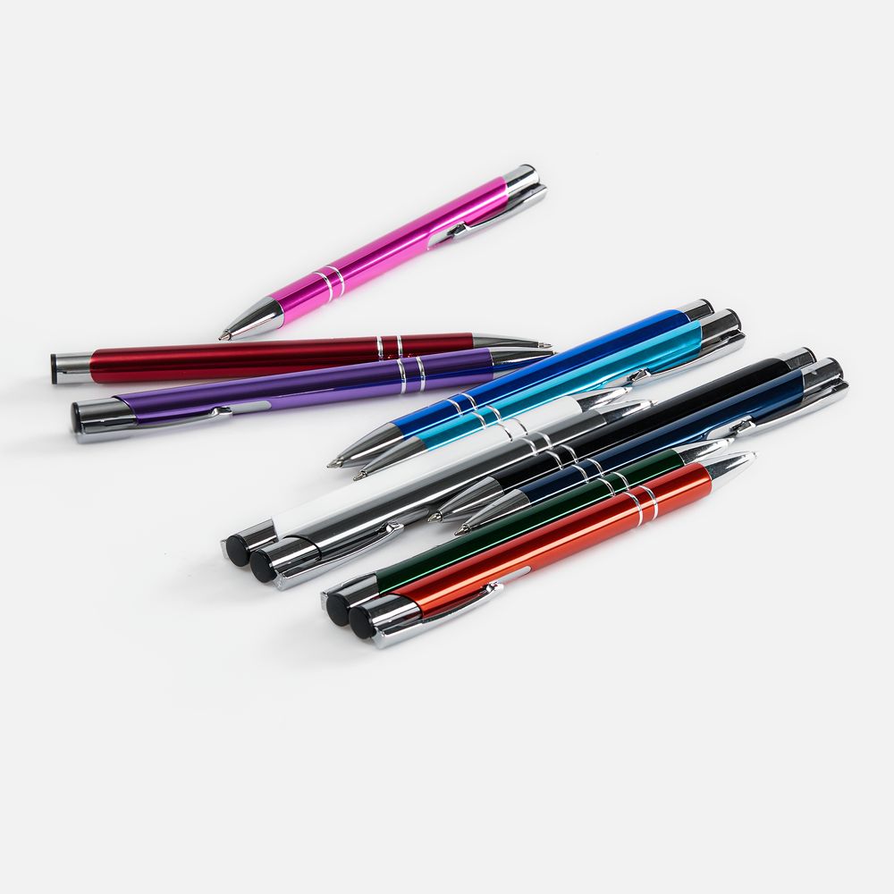 Яркая шариковая ручка с глянцевым цветным корпусом и хромированными деталями.
